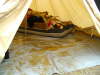 wegschwimmt und das Sonnensegel nicht eingedrückt wird. Unser Lager meistert diese erste Herausforderung mit einer trockenen Sitzgruppe, aber im Nachbar-Lager ist “Landunter”. Sigi und Finn können einem leid tun.